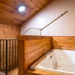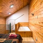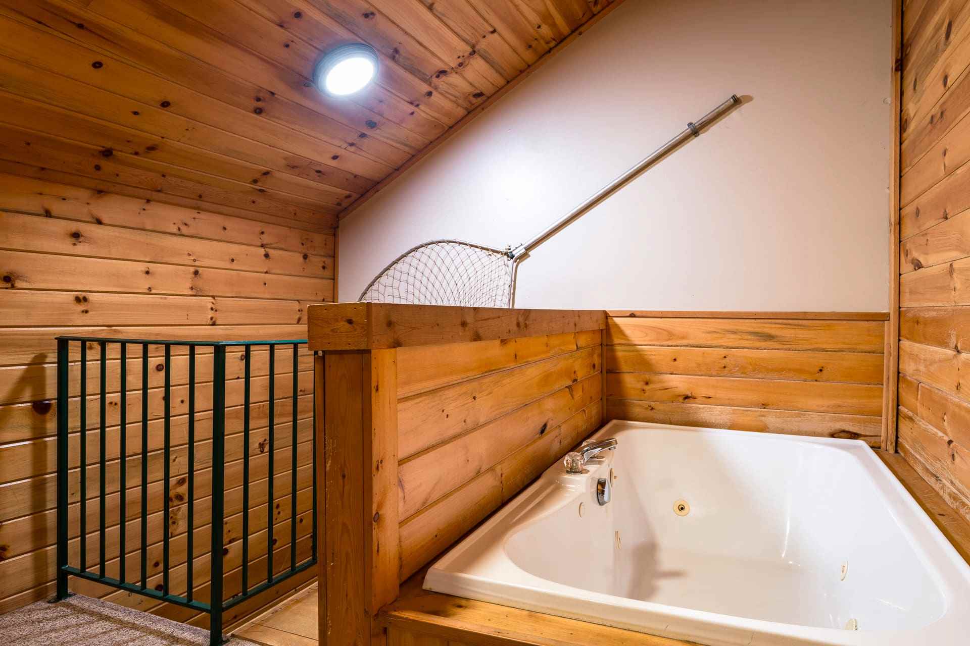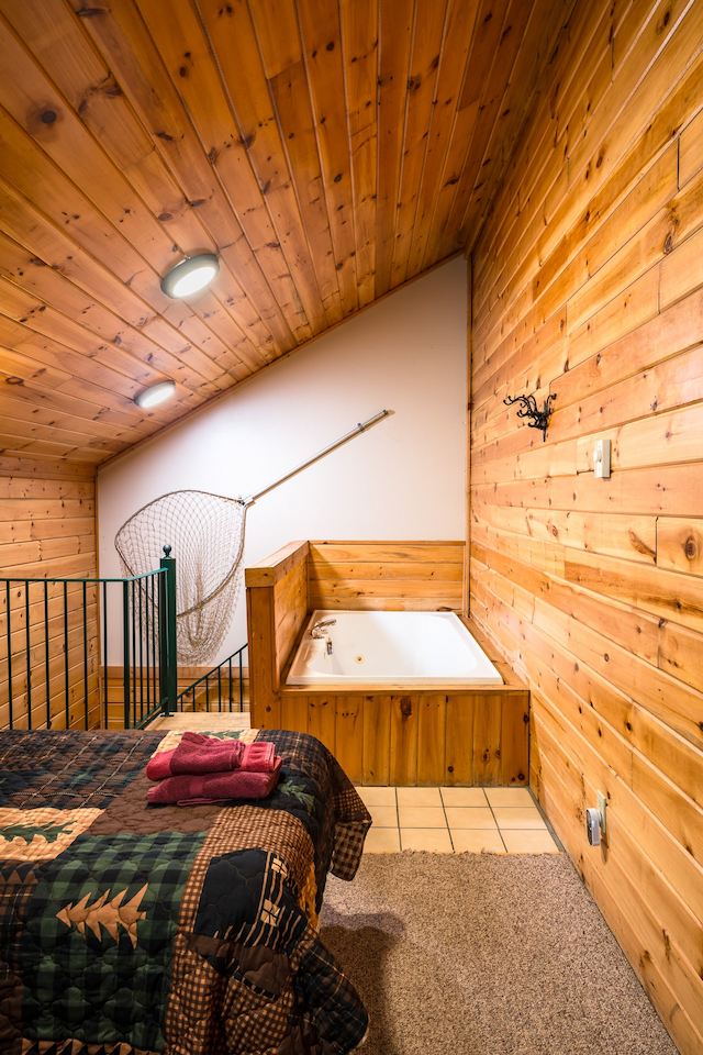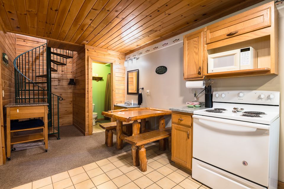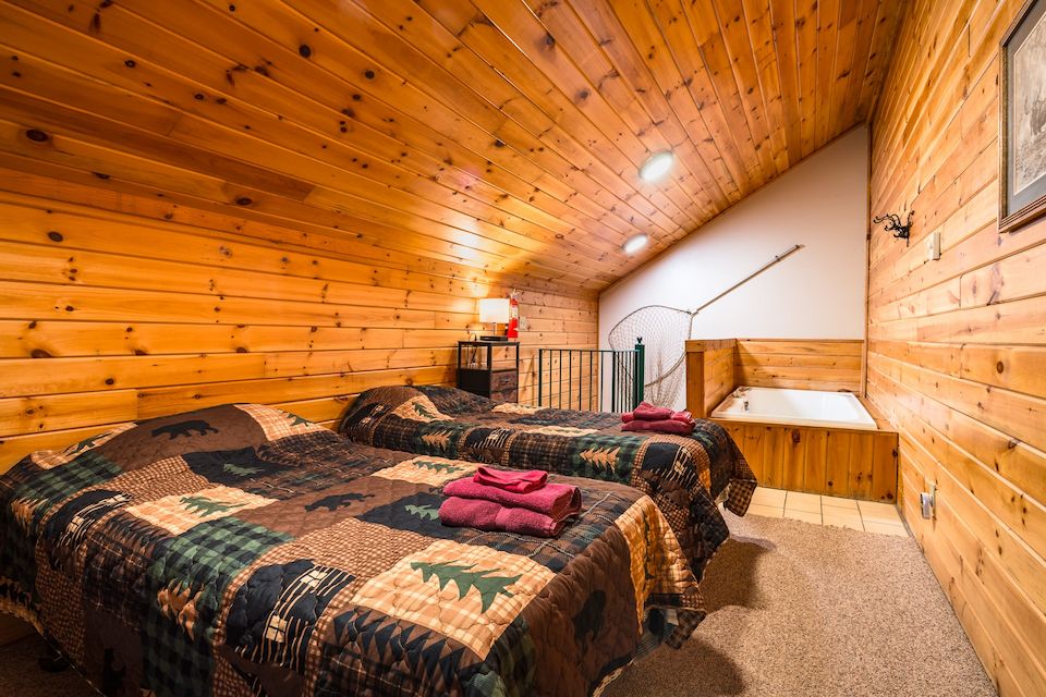 Each unit is thoughtfully decorated in warm Northwoods style and designed to feel like a private cabin, with its own entrance from a spacious wraparound deck. Inside, you’ll find a private bedroom with a queen-sized bed, plus a loft with three twin beds and a whirlpool bathtub—a perfect spot to soak and relax after a day on the water. The living area includes a futon sleeper sofa, a gas fireplace, and plenty of space to unwind.